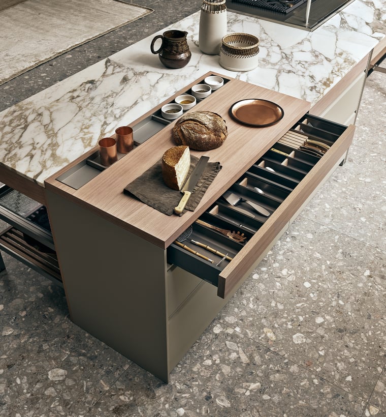 is a contemporary kitchen concept that harmoniously blends industrial aesthetics with refined elegance. Inspired by large workbenches found in industrial settings, K-Lab features a modular open-fronted system known as K-System, comprising aluminium elements and oak finishes. This design allows for customizable configurations, including base and wall units, cupboards, hoods, and tables, providing both functionality and visual dynamism. The kitchen incorporates high-quality materials such as Calacatta marble, Nordic oak, and Moka Zero Gloss lacquered finishes, enhancing its sophisticated appeal.